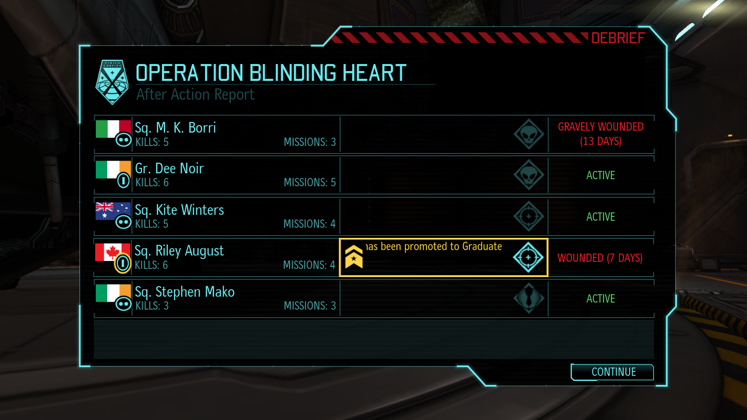 Mission7GEOSCAPE "Rise and shine, Headmaster. Rise and... shine. Not that I... wish to imply you have been sleeping on the job. No one is more deserving of a rest, and all the effort in the world would have gone to waste until... well, let's just say your hour has... come again. The right man in the wrong place can make all the difference in the world. So, wake up, Headmaster. Wake up and... *smell the ashes*..." Is the Thin Man talking to me? The speech pattern seems as subtly off as their movements were. Wait. Oh fuck you, I never could finish that game. Wait. You shot me. Twice. Through a brick wall and the door of a car. You killed me, you asshole! But you didn't get any of my friends! I win! I WIN! "God damn it, make with the sedative already!" "We cannot, the patient's neurochemistry precludes -" "I don't CARE! Fucking nutcase." The Thin Man socks me, knocking me out. Now he's wearing a green sweater. "... I win! I win!" And that's when Bradford had to knock me out, what with me trying to strangle him even as the life support tubes coming out of my chest were coming loose. Bradford plays the back-to-back recordings of me acting like a complete tit, both at the end of the botched mission when I flat out panicked and curled up into a ball, and when I come to in the medbay. While offering praises to Riley for reaching what he considers an adequate battlefield proficiency given how he dispatched the last Thin Man after I got shot at and panicked, he goes on saying that I am confined to the med bay for my own safety and the safety of others, and he will take command of the Extraterrestrial Combat Academy until I have recovered physically and mentally or or the Council appoints a replacement. \ ![]() (OOC Note: Apparently, I ran afoul of a known cover/hitbox bug. I will keep the result of the mission, but I replayed it until I got a critical wound rather than death for myself, so that the story can comtinue.) The briefing is given to the entire base personnel via video, with Bradford using the giant situation room projector screen as a backdrop. I'm still woozy, and wonder if it's evidence of some sinister conspiracy that he has access to that control and I don't, then I remind myself that Bradford being a Thin Man was just me hallucinating. Behind him, the tape plays a loop of me being a moron. The first order of business is to put Lena back in charge of all training. The second is to resume research on the yellow canisters; the nanomachines contained therein, despite the obvious danger, might have led to better medikits. Dr. Shen's experimental warfare project is put on hold, and the engineering and research team separated again. The third is to integrate into the combat doctrine file -- pending its complete rewrite by Bradford and Lena's hands -- that no one combatant should take it upon themselves to be a fire sponge, no matter how tough they think they are. The fourth, and last for the day, is to deal with all non-military personnel by either formally conscripting them or sending them home, at Bradford's discretion -- this effectively means that my friends are to be brought to the floatplane that will take them to Osaka Airport and from there back to their homes. I can barely move; after I tried to sit up, the tubes going in and out of me have been covered with a strong fabric mesh which I suspect is what's left of my underarmor -- good job, Dr. Shen, that thing kept me alive. All I can do is watch how my friends react to this second attempt at a coup... Riley is also in the medbay -- I can't see him anywhere, though -- and his evacution is postponed until he can walk. He is slated to leave as soon as possible. He says this bullshit is no way to fight an alien species, and says "tell the X-Com director this is officially a race". (As written by Riley August) I don't know if he's talking about me or Bradford, but hope it's the latter. Kite was slated to leave as soon as possible, upon arrival of the troops assigned to escort her to a holding cell to await arrival of the flightplane, finding her at the back of the barracks, still holding her sniper rifle, now lain upon an improvised bipod aimed at the barracks door, the matter was opened to discussion. It is believed some accommodation may be reached to continue her employment due to a position of "The nice men in overly tailored suits promised signing up for this meant killing things until the end of the war. I like this plan. Therefore, I suggest you keep me pointed at the aliens, because contrary to popular belief and common law, I am none to picky about the boundary conditions of the logical set 'things'." (As written by Kite Winters) Bradford and Lena have a row about the matter, but the lack of anything resembling qualified snipers plus the renewed emphasis on the need for secrecy means that Lena wins out; the alternative would be to set up a brig and live with the obvious damage to morale. Therefore, Kite remains with the project. Lena seems to have developed at least a grudging respect for Kite; seeing her in action probably helped. Vee is slated to leave as soon as possible, but took Dr. Shen aside to discuss things before she could be put into custody; who knows what will happen. Stephen is planning to stay for the forseeable future; not content to sit down and take defeat from a group of mindless aliens. (As Written by Stephen Mako). Bradford lets him know that he has no say on the mission rotation one way or the other, but seems OK with letting Stephen stick around at least as long as Riley is bedridden. I can't tell if Bradford genuinely doesn't want to antagonize us, or is just trying to perform a graceful takeover. Possibly a bit of both. Bradford's management seems to not impact the lives of our trainees particularly much; there's a requirement to be in uniform at all times during the two on-duty shifts, corridor lines are painted for rookies to follow like at a military academy, and I get to see more salutes... not to