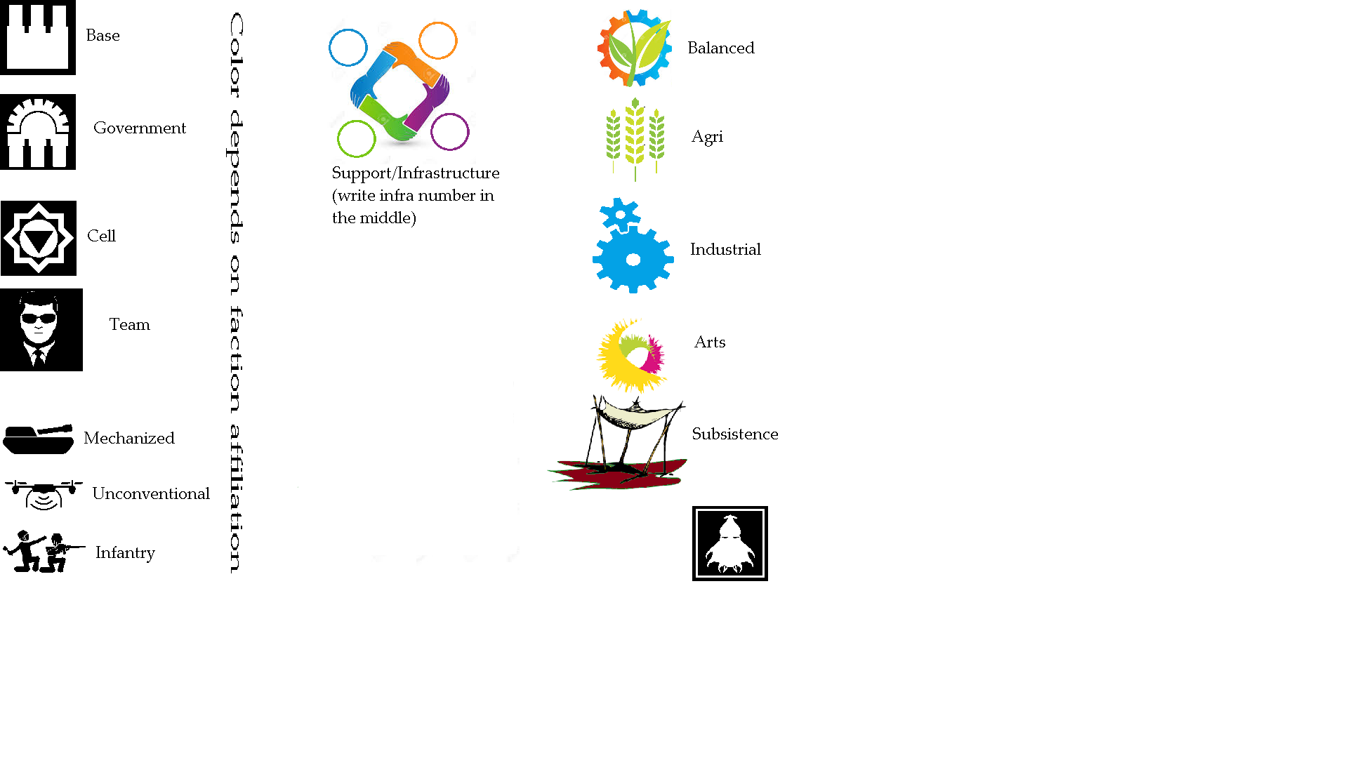 PROGRAM CARDS A faction can launch a program to build a specialized weapon, facility, or doctrine. Programs have have an infrastructure cost to symbolize diverting a region's production from local needs - simply remove the relevant infrastructure from the region to begin a program. To ensure sufficient buy_in from the population, your support in that region must be greater than the program cost by a factor of (value). Programs require a preexisting base, which cannot be used for anything else while the program is being run (the program cost already includes the base's output). Media Saturation - A media saturation program allows shifting support between factions; normally this is done to raise support, but it may also used to lower support. This program must not necessarily be deployed in the same region it is built in: for example, it is possible to saturate the American Northwest with media from Japan. Requires: Cell. Convoy - A convoy program negates a "Drought and Famine" Act of God upon a region. Cost: (power) infrastructure from an Agriculture region. Requires: Team. Subterranean Facilities - A subterranean facilities program negates a "Sodom and Gomorrah" Act of God upon a base as the underground facilities quickly allow reconstruction of the aboveground setup. Cost: (unit) infrastructure from an Industry region. Requires: Base. Posthuman Hardening - The posthuman hardening program negates a "Smite" Act of God upon a team - . Cost: (unit) science. Requires: Cell. Satellite - A satellite program launches an object into low Earth orbit. This can be used for positioning, communications, or surveying - whatever its purpose, it results in a small increase in infrastructure from your faction to all regions. However, there are diminishing returns, so each successive satellite returns half the gains. In addition, when the satellite is launched, new pictures of the cosmos beyond the firmament's canopy result in a recruitment bonus. Cost: (unit) science, (unit) infrastructure from an Industry region. Heavy Lift - A heavy lift program launches one Notark component into low earth orbit. In addition, when the component is launched, new pictures of the cosmos beyond the firmament's canopy result in a recruitment bonus. Cost: Owned territory, (unit) science, (unit) infrastructure from an Industry region. Giant Explosion! - Whether it is the restoration of an ancient nuclear warhead, the careful planting of multiple caches of conventional explosives, or something entirely new such as a seismic demolition system, this emulates a "Sodom and Gomorrah" Act of God. Cost: Owned territory, (unit) science, (unit) infrastructure from an Industry region. Requires: Team. Army - An army program raises a military unit. The unit type depends on the region: Infantry for agricultural regions, Mechanized for industrial regions, and Unconventional for arts region. In general, Unconventional beat Mechanized beat Infantry beat Unconventional . SUBVERTING A REGION When the support for one group exceeds the sum of the support for the other two, an attempt to subvert the region may be made. This can take the shape of occupying government buildings, formally running for an election, becoming the non-elected ruler's trusted advisor, and so on. Note that outright taking over a region from Yahweh will likely result in an Act of God! In a subversion attempt, the subverting team rolls its highest attribute (military, espionage, persuasion) against the corresponding attribute of the best team or cell from the currently ruling faction. If successful, the region changes allegiance. The advantage of outright owning a region are few, but important: The region's specialty can be changed, and some program cards require owning a territory. TEAMS Teams have three stats: overt, covert, and nonviolent. The "overt" stat is used for direct strikes against cells, bases, or other teams; a team can be used to lead army units into an all-out fight. The "covert" stat is used for indirect strikes such as sabotage, espionage, and subversion. The "nonviolent" stat is used for debates, diplomatic efforts, and peace brokering. Teams are moved around on the map, and are used to initiate actions; they can found cells. CELLS Cells are the basic organizational structure of any faction, whether it be a welcoming Children of the Tribulation mission house, a poorly hidden TOL den of supposed iniquity, or an efficient gaming shop that doubles as a Shadow meeting hall. They are used for recruiting for roving teams (a team with more, or better, people in it is more effective), most nonviolent tactics, and some violent tactics. Cells have three stats: overt, covert, and nonviolent. The "overt" stat is used for direct strikes against cells, bases, or other teams; a team can be used to lead army units into an all-out fight. The "covert" stat is used for indirect strikes such as sabotage, espionage, and subversion. The "nonviolent" stat is used for debates, diplomatic efforts, and peace brokering. Cells are stationary, are used to support teams and continue actions, and can construct bases. If a player's team is eliminated, a cell sheds its infrastructure and turns into a roving team. BASES Bases are larger installations that can contribute to a region's infrastructure, build military might, or conduct what little scientific research goes on in the Millennium. While cells can scatter and reform after a raid, making them hard to eradicate, bases may be destroyed by military action and are in that sense more fragile. Bases are large installations that can be used for production. Their only stat is productivity, which can be used for research rolls, added to the region's infrastructure each turn, or subsumed into the development of a program. ARMY An army can belong to one of three types (Infantry, Mechanized, Or Unconventional) and only has a military stat; the military stat of an army can be added to that of a cell or team, but at the price of bringing their oth
